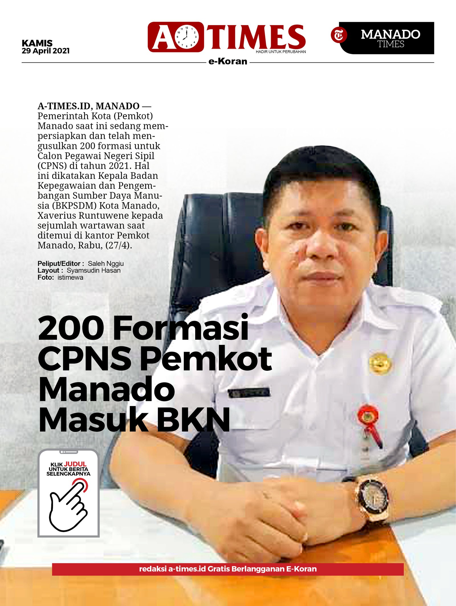 A-TIMES.ID, MANADO — Pemerintah Kota (Pemkot) Manado saat ini sedang mempersiapkan dan telah mengusulkan 200 formasi untuk Calon Pegawai Negeri Sipil (CPNS) di tahun 2021.