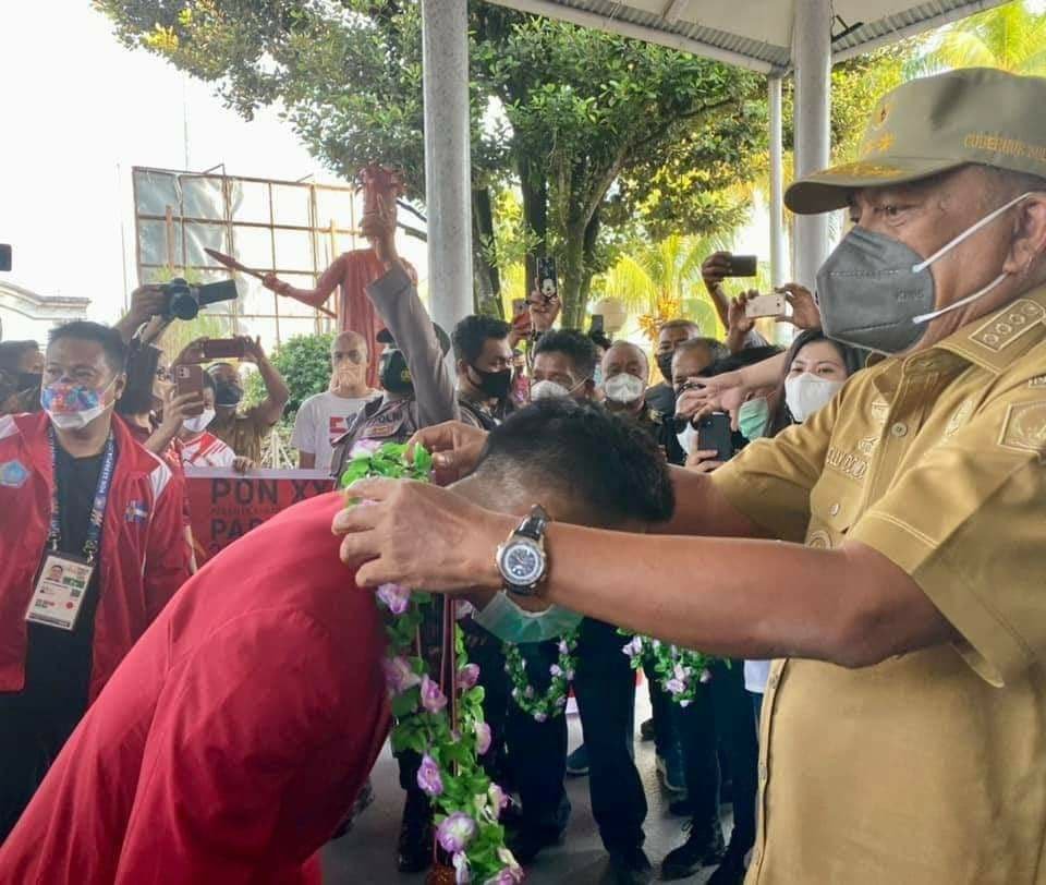 A-TIMES.ID, MANADO — Gubernur Sulut Olly Dondokambey Selasa (5/10/2021) menyambut kedatangan duta PON XX Papua yang sudah membawa nama harum daerah Sulawesi Utara yakni tim Muay Thai di Bandara Sam Ratulangi Manado.