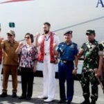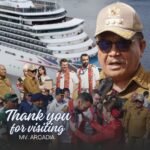 Wali Kota Bitung Ir Maurits Mantiri bersama nakhoda Kapal Pesiar MV Arcadia dan ribuan turis(*) A–TIMES,BITUNG–Pemkot Bitung sukses mendatangkan Kapal pesiar MV Arcadia yang memuat ribuan