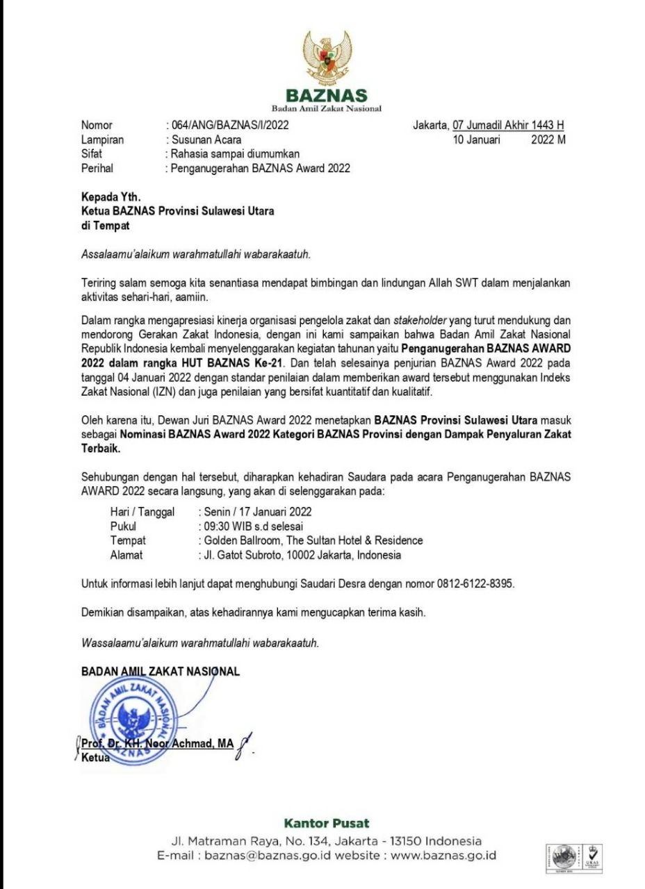 Masuknya Baznas Sulut sebagai salah satu nominasi award di awal tahun 2022 itu tertuang dalam surat Nomor 064/ANG/BAZNAS/I/2022, dan ditandatangani Ketua Badan Amil Zakat Nasional Dr. KH. Noor Achmad, MA.