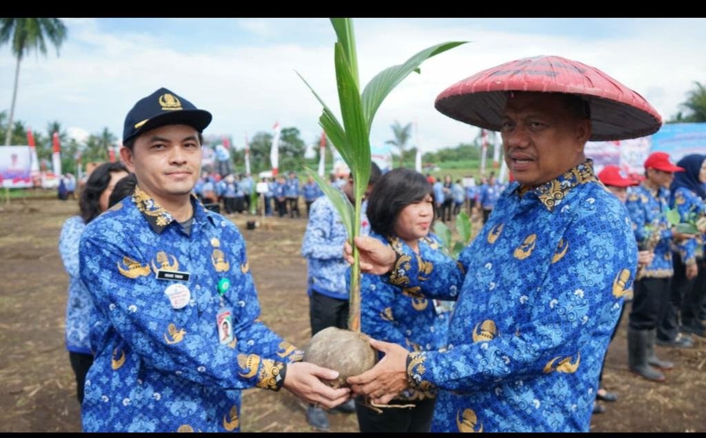 Usai upacara bersama ribuan ASN, Gubernur Olly Dondokambey bersama jajaran melakukan penanaman bibit rica, kelapa serta berbagai komoditi lainnya pada areal yang sudah disiapkan.
