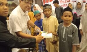 Usai buka puasa dan sholat Magrib, para anak yatim yang datang sejak sore hari didampingi keluarga dekat masing masing, menerima sedekah uang tunai masing masing Rp100.000 per anak.