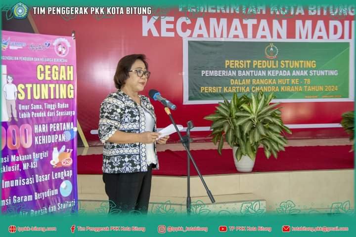 A–TIMES,BITUNG– Pemkot Bitung terus berupaya memacu program  penurunan stunting. Bersama pihak terkait kolaborasi menekan angka stunting sebagaimana program pemerintah pusat. Rabu (24/1/2024) Ketua  TP PKK Kota Bitung Ny. Rita Mantiri – Tangkudung, S.T., didampingi Ketua DWP Kota Bitung Ny. Nurjaya Theno – Munarwin, S.E., bersama Pengurus dan Anggota TP PKK Kota Bitung menghadiri acara Bakti Sosial Peduli Stunting dalam rangka HUT ke 78 Persit Kartika Chandra Kirana Tahun 2024 di Aula Kantor Kecamatan Madidir. Tangkudung dalam sambutannya mengatakan Jumlah anak stunting Kota Bitung hasil pengukuran Agustus 2023 oleh Dinas Kesehatan Kta Bitung sebesar 210 anak, dan dari 8 Kecamatan, Kecamatan Madidir tertinggi diikuti kecamatan Aertembaga. Isteri Wali kota Bitung ini juga menjelaskan beberapa hal yang menjadi penyebab stunting. Selaku Bunda Pendamping Keluarga Kota Bitung sudah ada 174 Tim Pendamping Keluarga yang terdiri dari kader kesehatan, kader KB, kader PKK. Bunda Pendamping  keluarga sudah terbentuk di Kota dan semua Kecamatan dan sudah dikukuhkan untuk melakukan pendampingan dan fasilitasi kepada Catin, bumil, ibu Nifas dan baduta/balita untuk penanganan dan pencegahan stunting. Bunda Paud Bitung itu juga  menyerahkan Bantuan kepada Anak Stunting.(*/adve)