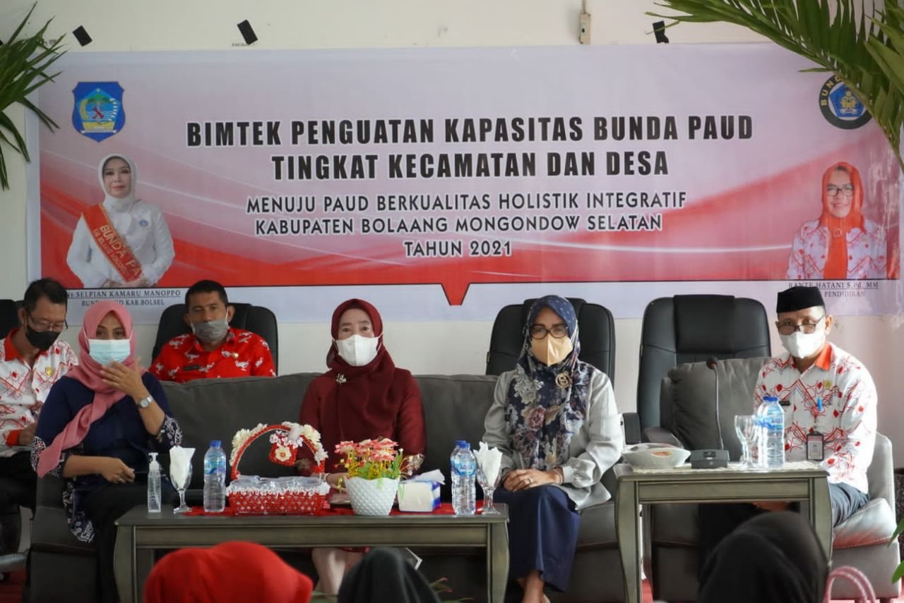 A-TIMES.ID BOLSEL – Bunda PAUD Kabupaten sekaligus Ketua TP-PKK Kabupaten Bolsel Selpian Kamaru-Manoppo bersama Kepala Dinas Pendidikan Rante Hatani SPd, MSi membuka kegiatan Bimtek Penguatan Kapasitas Bunda PAUD Tingkat Kecamatan dan Desa dengan tema “Menuju PAUD Berkualitas Holistik Integratif” Tahun 2021 di Ruang Pertemuan Dinas Pendidikan, Kawasan Perkantoran Panango, Kamis (11/11/2021).