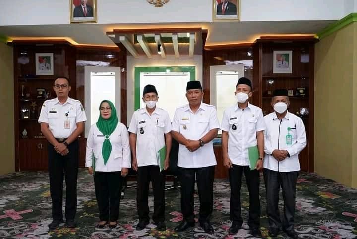 A.TIMES, BOLMUT – Bupati Bolaang Mongondow Utara (Bolmut) Drs. Hi. Depri Pontoh serahkan SK PLT Kepala Dinas Perpustakaan dan Kearsipan Daerah kepada Dra Enameti Humokor, dan SK Pj untuk dua kepala Desa Langi serta Desa Mokoditek, di ruang kerja Bupati, Rabu (20/04).