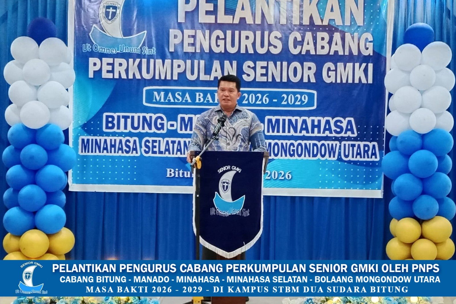 A—TIMES,BITUNG–Pengurus Cabang Perkumpulan Senior Gerakan Mahasiswa Kristen Indonesia (GMKI) Bitung harus mampu bersinergi di tiga medan pelayanan Gereja, Perguruan Tinggi dan Masyarakat bersama Pemerintah dalam melahirkan ide dan gagasan untuk kemajuan Kota Bitung. Hal ini ditegaskan Ketua PC PS GMKI Bitung terpilih, Alfred Salindeho, SE MM saat sambutan pada pelantikan Pengurus Cabang Perkumpulan Senior (PC PS) Gerakan Mahasiswa Kristen Indonesia (GMKI) di 5 kabupaten dan kota se Sulut, resmi dilantik, Selasa (14/4/2026) di aula Sekolah Tinggi Bisnis Manajemen (STBM) Bitung.