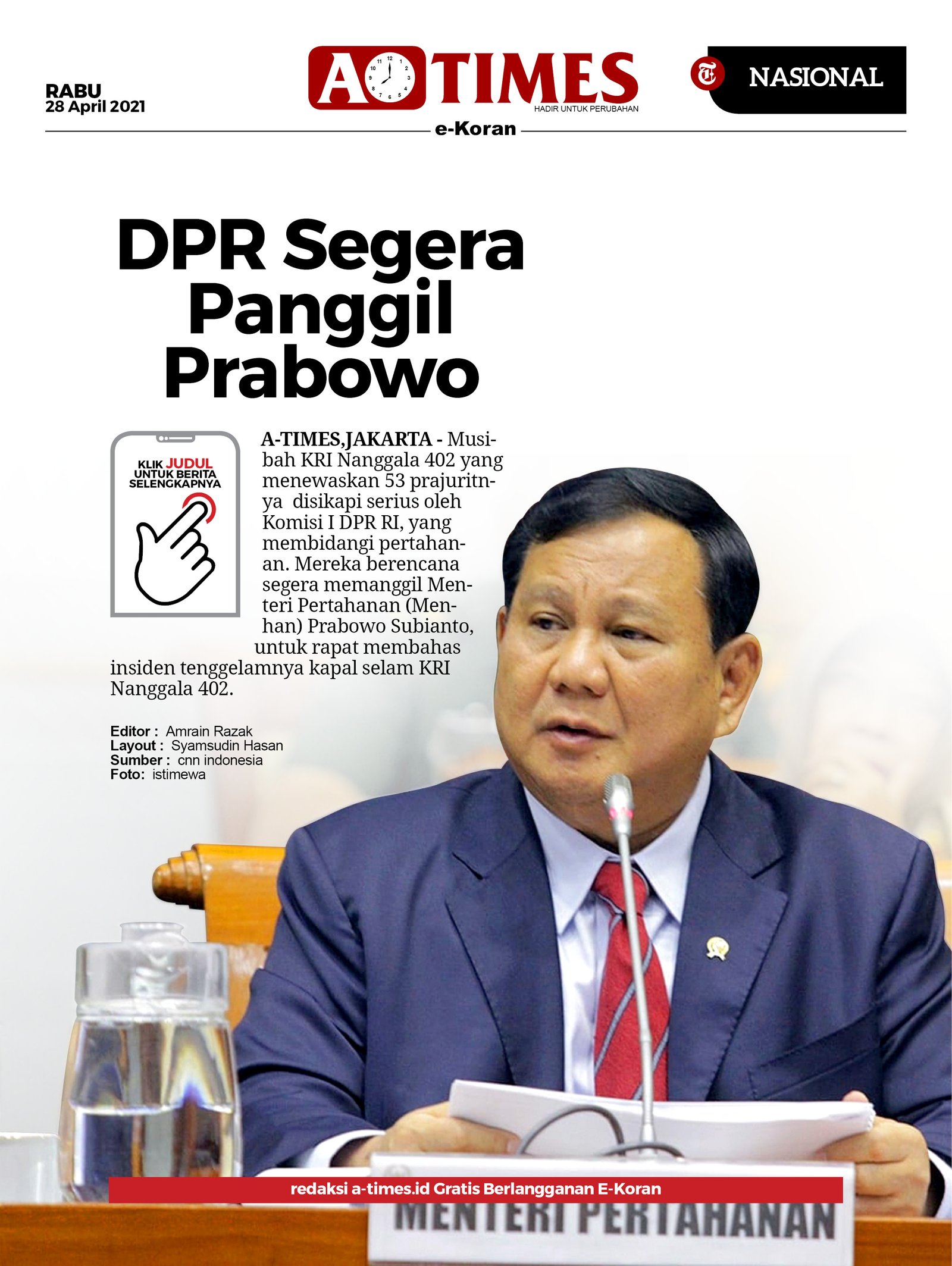 “Masih reses kami. Kami baru masuk masa persidangan 6 Mei. Sudah begitu cuma dua hari langsung libur lagi,” kata Farhan. Menteri Pertahanan Prabowo Subianto mendapat sorotan setelah kapal selam KRI Nanggala 402.