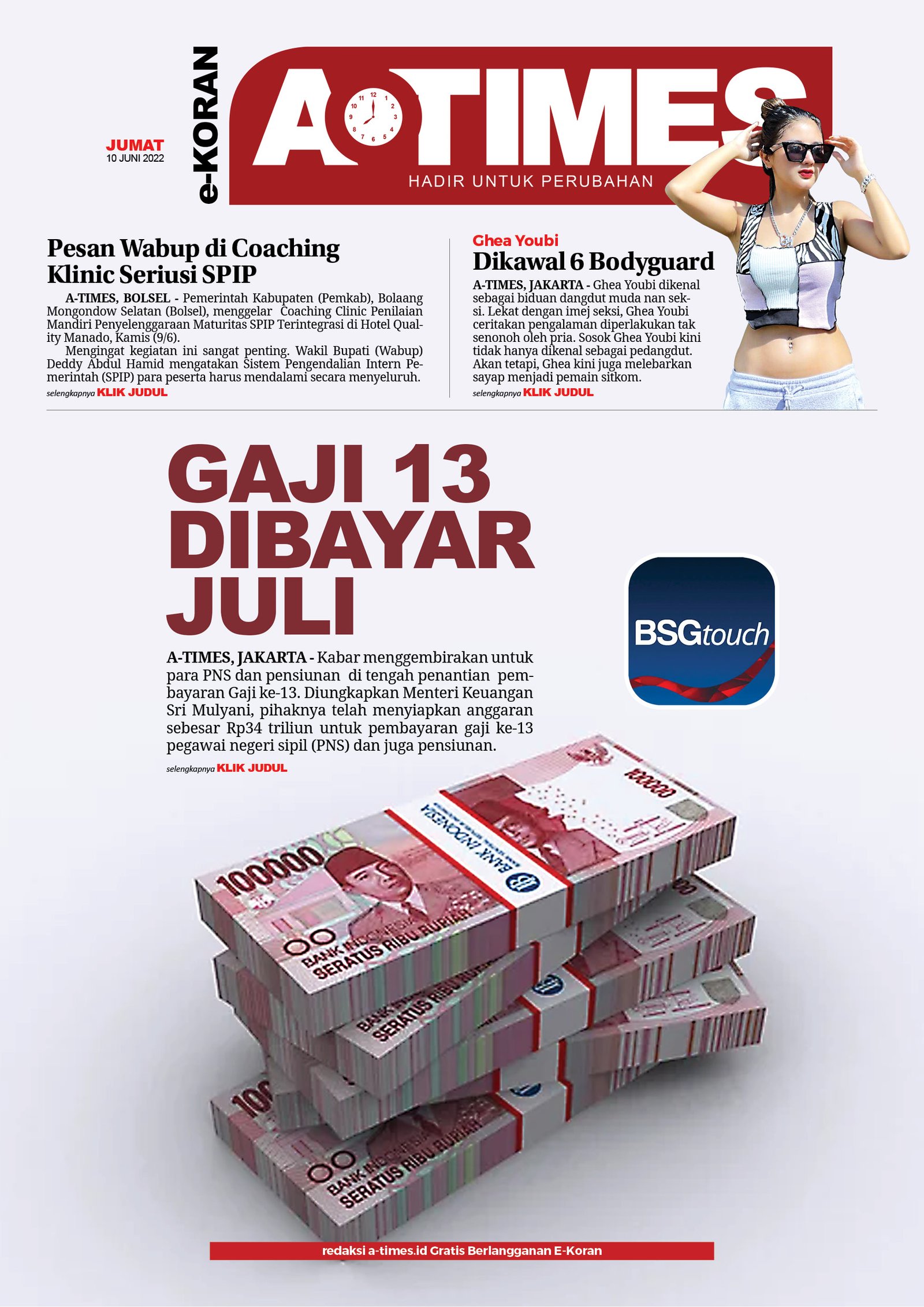 Edisi Jum’at, 10 Juni 2022A-TIMESJuni 10, 2022Juni 13, 2022E-Koran Berita Terkait: Edisi Jum'at, 15 April 2022 Unduh versi PDF-nya dengan menekan tombol DOWNLOAD di bawah ini: [wpdm_package id=’25915′] Berita TerkaitEdisi Jum’at, 22 Juli 2022Edisi Jum’at, 15 Juli 2022Edisi Jum’at, 8 Juli 2022Edisi Jum’at, 1 Juli 2022Edisi Jum’at, 24 Juni 2022Edisi Jum’at, 3 Juni 2022Edisi Jum’at, 27 Mei 2022Edisi Jum’at, 20 Mei 2022Jangan LewatkanEdisi Senin, 12 Februari 2024Jadi Irup HUT RI, Gubernur Selip Filosopi Makan Sayur PareEdisi Rabu, 27 Juli 2022Edisi Selasa, 26 Juli 2022