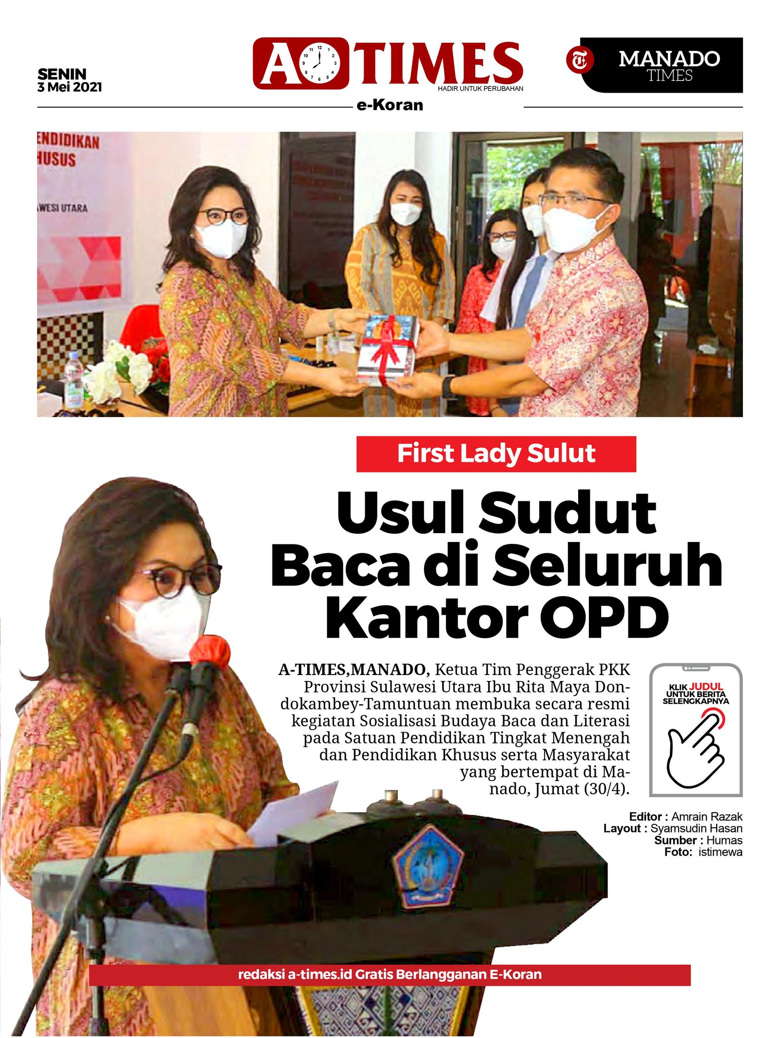 A-TIMES.ID, MANADO — Ketua Tim Penggerak PKK Provinsi Sulawesi Utara Ibu Rita Maya Dondokambey-Tamuntuan membuka secara resmi kegiatan Sosialisasi Budaya Baca dan Literasi pada Satuan Pendidikan Tingkat Menengah dan Pendidikan Khusus serta Masyarakat yang bertempat di Manado, Jumat (30/4).