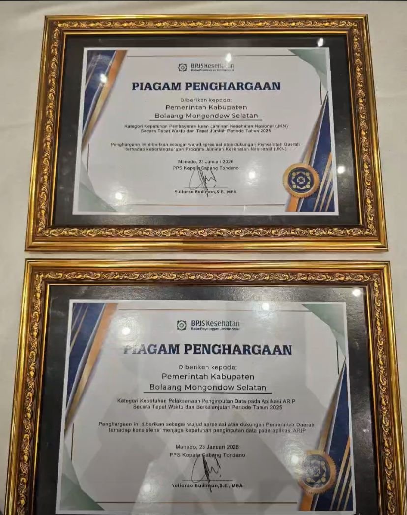 Dua penghargaan tersebut diserahkan langsung oleh Kepala BPJS Kesehatan Cabang Sulawesi Utara Yuliarso Budiman kepada Kepala Badan Pengelola Keuangan dan Aset Daerah (BPKAD) Bolsel Lasya Mamonto SPt, ME yang mewakili Pemerintah Daerah dalam acara Rekonsiliasi Data Setoran Iuran Wajib PPU-PN Tahun 2025 di Hotel Luwansa Manado, Jumat (23/1/2026).