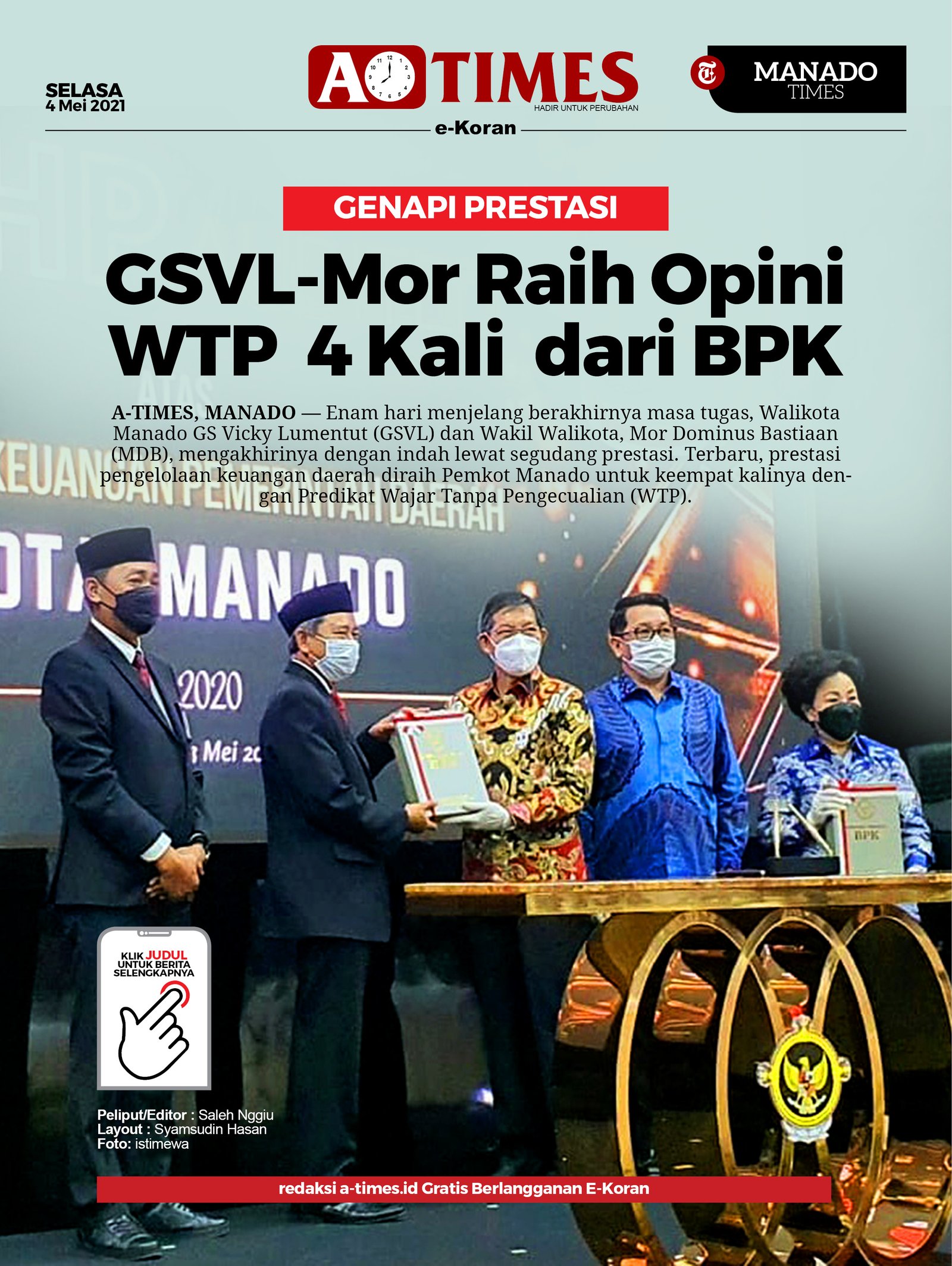 Nilai tertinggi dalam pengelolaan keuangan daeraah itu diberikan Badan Pemeriksaan Keuangan (BPK) Perwakilan Sulawesi Utara (Sulut), Senin, (3/5) kemarin, dengan hasil penilaian Opini Wajar Tanpa Pengecualian (WTP) untuk Pemerintah Kota (Pemkot) Manado.