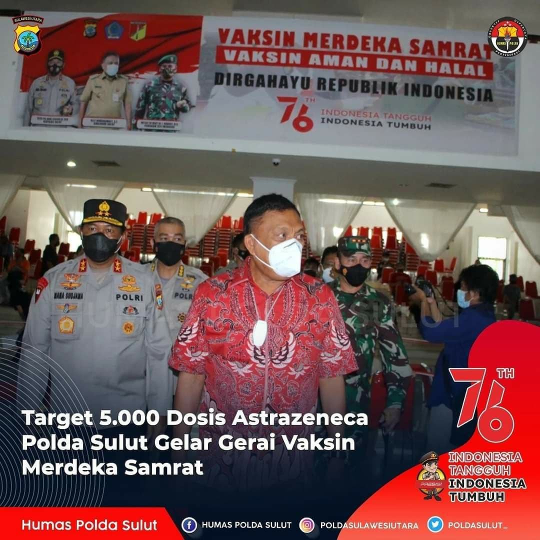 A-TIMES.ID, MANADO — Program Vaksinasi yang digelar Polda Sulut Kamis (13/8) dihadiri Gubernur Sulut Olly Dondokambey, didampingi Kapolda Irjen Pol Nana Sudjana bersama Pangdam XIII/Merdeka Mayjen TNI Wanti W. F. Mamahit, Ketua DPRD Sulut, serta Wakapolda Sulut Irjen Pol Rudi Darmoko dan para PJU Polda Sulut.