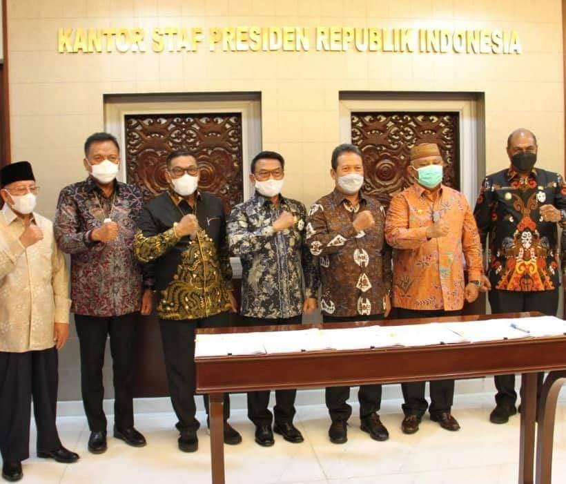 Gubernur Sulawesi Utara (Sulut) Olly Dondokambey (OD) melakukan Penandatanganan Perjanjian Kerja Sama (PKS) antar Pemerintah Provinsi Sulawesi Utara, Gorontalo, Maluku, Maluku Utara, Papua dan Papua Barat, di Ruang Rapat Utama, Kantor Staf Presiden (KSP), Gedung Bina Graha, Jakarta Pusat.