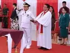 Turut hadir dalam pelantikan, Sekprov Sulut Steve Kepel, Jajaran Pemprov Sulut, Ketua Sinode GERMITA Pdt.Dr.Arnold Apolos Abbas Jajaran Pemkab Talaud serta Forkopimda Talaud.(adv/Kominfo)