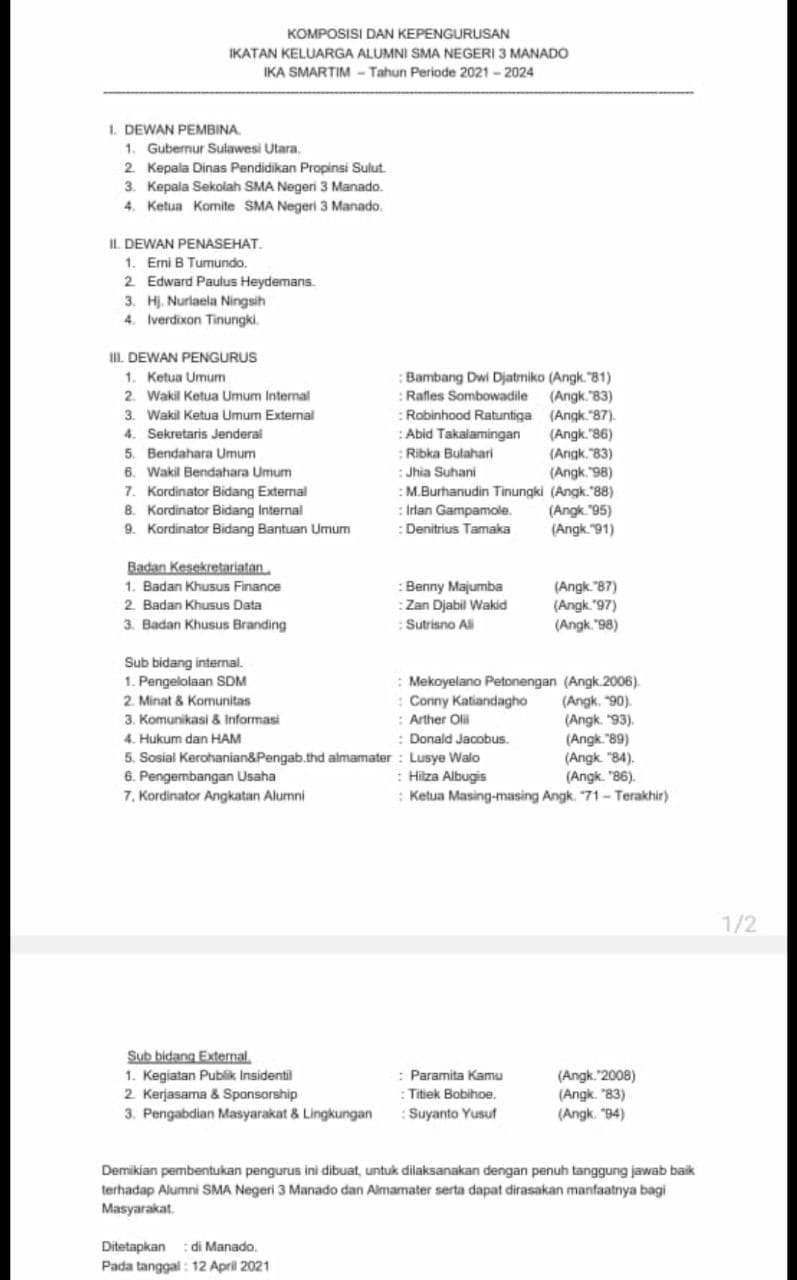 Diketahui, para pengurus IKA-SMARTIM yakni Ketua Umum, Bambang Dwijatmiko, Sekretaris Jenderal, Abid Takalamingan, Bendahara, Ribka Bulahari, Wakil Ketua Internal, Rafles Sombowadilo dan Wakil Ketua Eksternal, Robinhood Ratuntiga serta jajaran pengurus lainnya.
