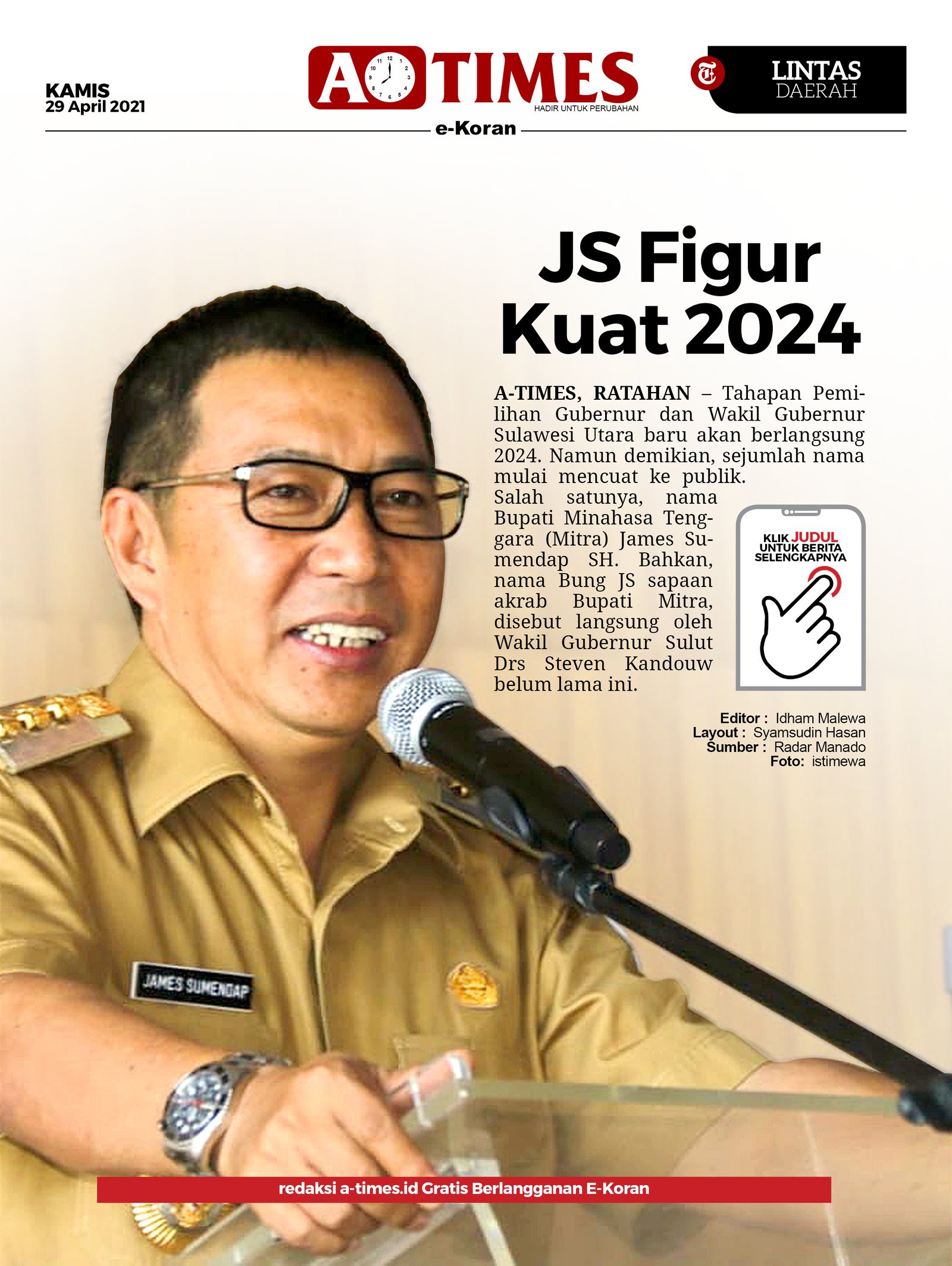 A-TIMES.ID, RATAHAN – Tahapan Pemilihan Gubernur dan Wakil Gubernur Sulawesi Utara baru akan berlangsung 2024. Namun demikian, sejumlah nama mulai mencuat ke publik. Salah satunya, nama Bupati Minahasa Tenggara (Mitra) James Sumendap, SH.