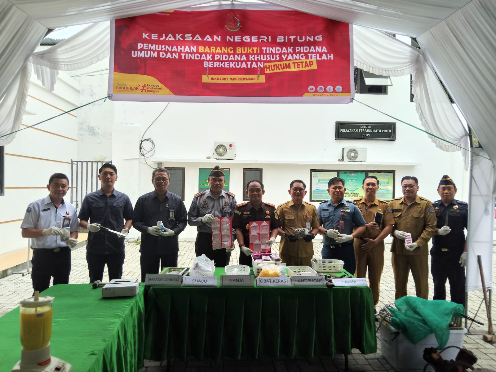 Sementara itu pemusnahan barang bukti obat keras dengan cara diblender, barang bukti sajam dimusnahkan dengan dipotong-potong dengan menggunakan mesin pemotong besi, sementara ganja, sabu serta benda lainnya dimusnahkan dengan cara dibakar. Turut hadir Sekretaris Daerah Kota Bitung Rudy Theno Panmud Pidana PN. Bitung Syaepudin Samalam mewakili Ketua PN. Bitung, Kepala Lapas Klas IIB Bitung Syukron Hamdani, Kasat Reskrim Iptu Gede Indra Asti mewakili Kapolres Bitung, Perwakilan PSDKP Bitung, Perwakilan Guskamla Komando Armada II Bitung, perwakilan Bea Cukai Bitung, para kasi, kasubagdan lainnya dijajaran kejari Bitung.(*)