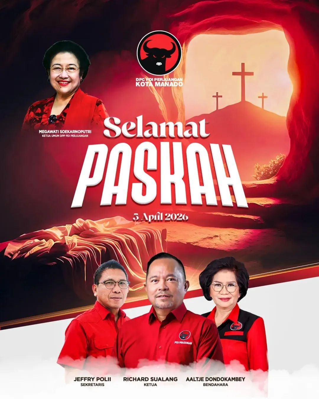 A—TIMES,MANADO–Keluarga besar PDI Perjuangan dibawah pimpinan dr Richard Sualang mengucapkan Selamat Paskah 2026.