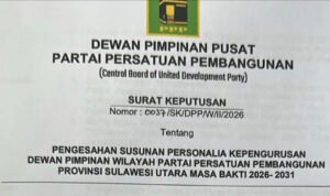 Aditya yang juga Wakil Bupati Bolmong Utara (Boltara) didampingi Sekretaris Wilayah PPP Sukut Mazhabullah Ali ini menjemput SK pengurus DPW PPP Sulut di kantor DPP PPP di Jalan Diponegoro Jakarta Pusat, Selasa (03/02/2026) sore.