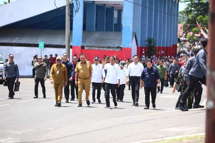 A–TIMES,BITUNG–Salahsatu agenda kunjungan Pressiden  Republik Indonesia Joko Widodo ke Sulut diantaranya ke kota Cakalang. Kedatangan presiden yang didampingi sejumlah mentri dan gubernur Olly Dondokambey disambut Wali Kota Bitung Ir Maurits Mantiri dan jajaran Forkopimda Kota Bitung. Saat tiba di Kota Cakalang Jumat (24/2/2024). Presiden 2 periode ini silaturahmi  dengaan peserta  dan pendamping program Membina Ekonomi Keluarga Sejahtera (Mekaar) Binaan Permodalan Nasional Madani(PNM), di GOR Manembo-Nembo. Usai itu Jokowi melakukan penyerahan bantuan pangan cadangan beras pemerintah di kompleks pergudangan Bulog Paceda I Kelurahan Paceda Kecamatan Madidir. Setelah itu sholat Jumat dan kemudian makan siang Revirside Cafe Manembo Nembo didampingi gubernur dan Wali Kota Bitung Ir Maurits Mantiri dan lainnya. Mantiri mengungkapkan ini  pengalaman kedua Jumpa Lagi dengan Presiden, serta makan bareng dalam satu meja, mengebrol banyak hal termasuk menanyakan Gasing, serta kunjungan kapal pesiar di bulan Maret 2024 serta antusias rakyat Kota Bitung menyambut kunjungan Presiden Ke Kota Bitung, adalah pengalaman yang sangat luar biasa, terakhir Presiden memuji durian lokal asal Kumersot yang enak. (*/adv)