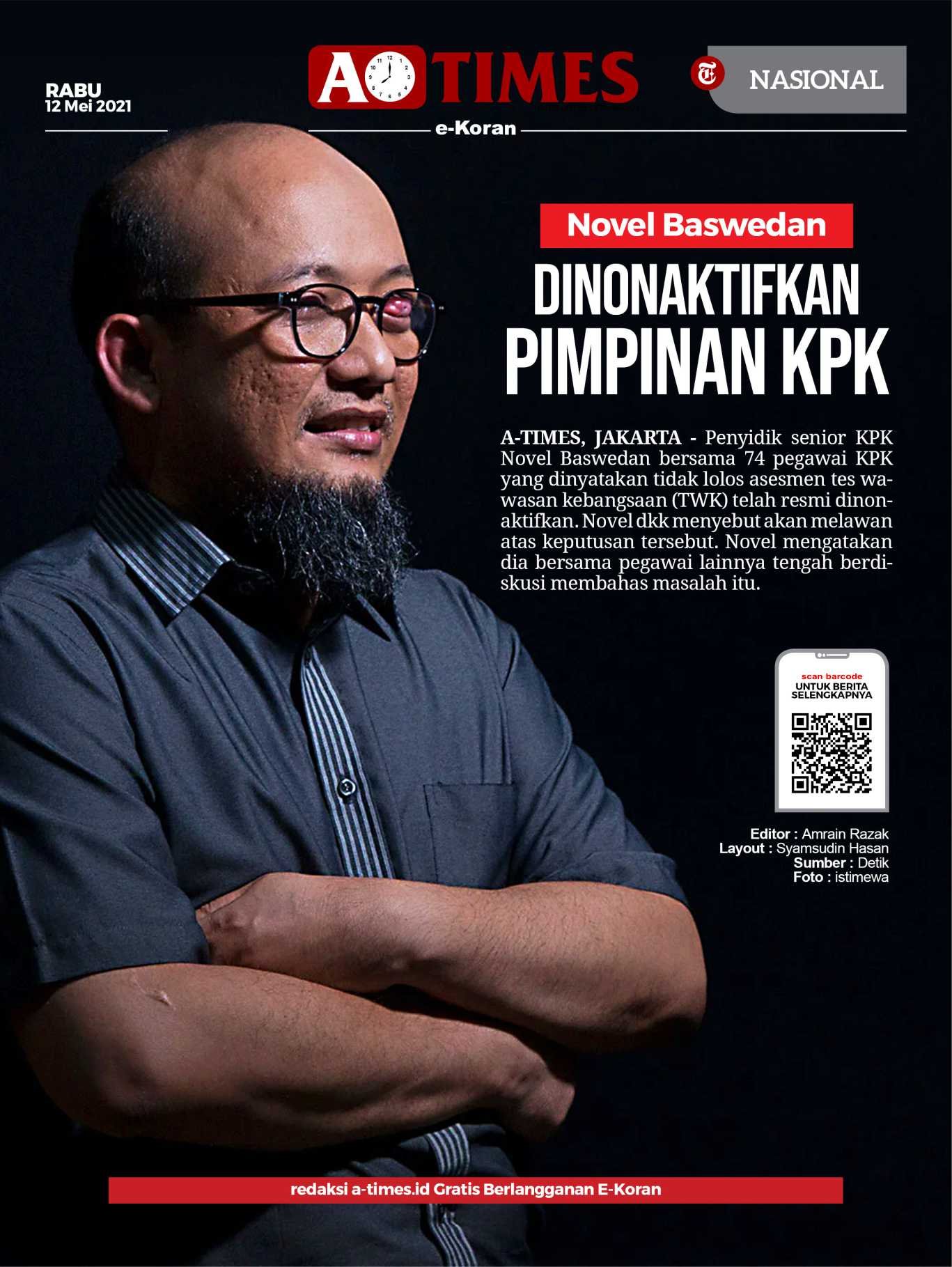 A-TIMES.ID, JAKARTA – Penyidik senior KPK Novel Baswedan bersama 74 pegawai KPK yang dinyatakan tidak lolos asesmen tes wawasan kebangsaan (TWK) telah resmi dinonaktifkan.