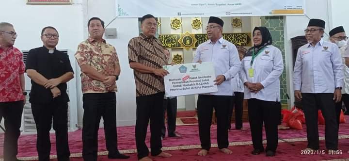 Gubernur Olly Dondokambey didampingi Wakil Gubernur Steven Kandouw, Sekdaprov Steve Kepel, juga Ketua Forum Kerukunan Umat Beragama Sulut Pdt Lucky Rumopa, menyerahkan secara simbolis bantuan sembako kepada mustahik zakat atau masyarakat yang benar-benar berhak mendapatkan bantuan zakat berdasarkan data Baznas Provinsi Sulut.