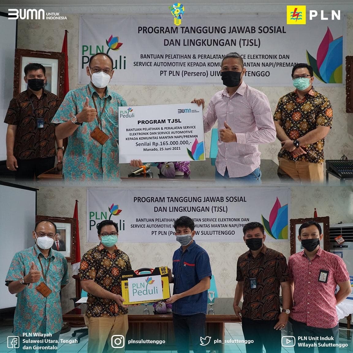 Bantuan dari Program Tanggung Jawab Sosial dan Lingkungan (TJSL) diserahkan langsung oleh Senior Manager Keuangan Komunikasi dan Umum PLN UIW Suluttenggo, Wijaya Gautama mewakili General Manager UIW Suluttenggo bersama Manager PLN UP3 Manado Andre Lengkong.