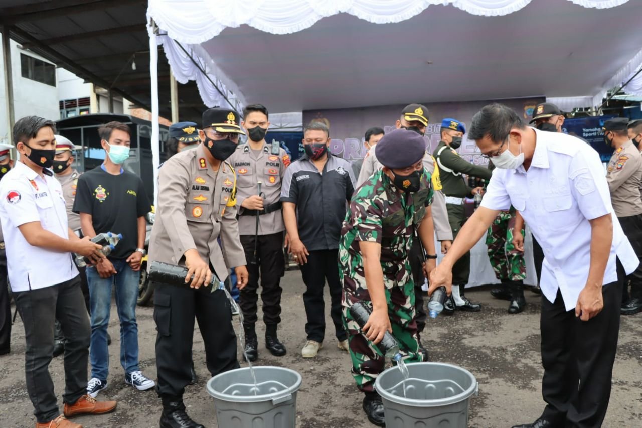 Pihaknya juga melakukan pemusnahan terhadap barang bukti minuman keras dan knalpot bising atau tidak standar. Menurut Kapolres, 3450 liter miras tersebut disita dari berbagai tempat di wilayah hukum Polres Bitung. “Ini disita dari berbagai tempat, ada yang dijual di warung, ada juga yang sembunyi,” jelasnya.