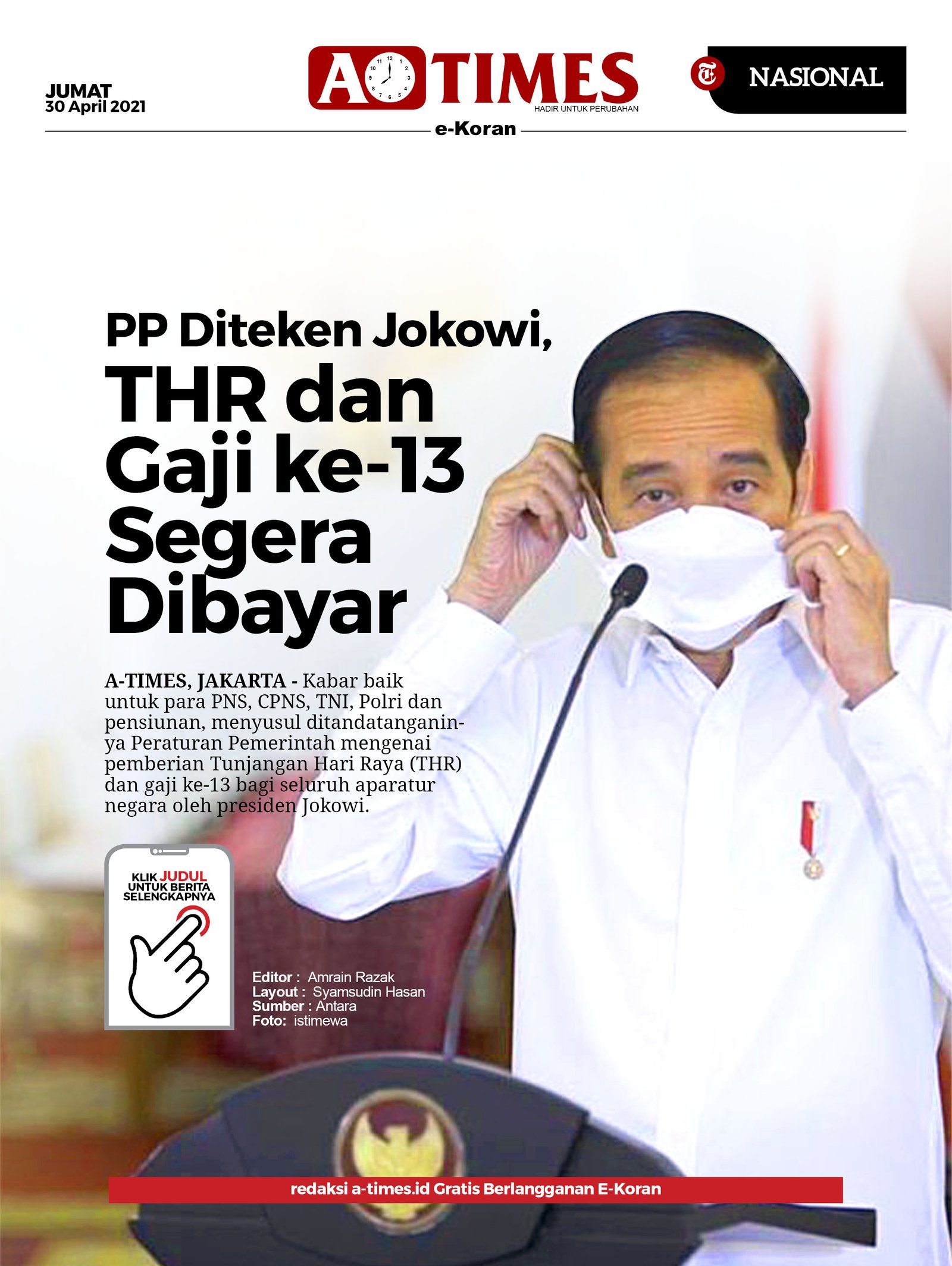 A-TIMES.ID, JAKARTA – Kabar baik untuk para PNS, CPNS, TNI, Polri dan pensiunan, menyusul ditandatanganinya Peraturan Pemerintah mengenai pemberian Tunjangan Hari Raya (THR) dan gaji ke-13 bagi seluruh aparatur negara oleh presiden Jokowi.