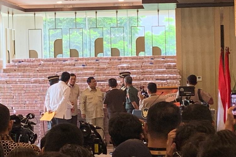 Pantauan Kompas.com di lokasi, uang yang diserahkan Kejagung ke negara itu dipajang di Lobi Utama Kejaksaan Agung, Jakarta, Senin (20/10/2025).