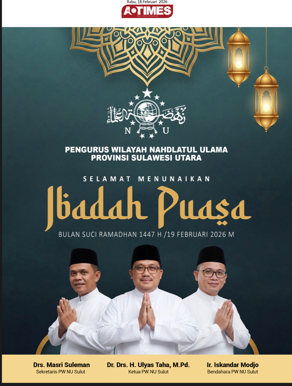 PW NU SULUT UCAPKAN MARHABAN RAMADHAN 1447 H/2026 MredaksiFebruari 19, 2026Februari 19, 2026Berita Utama Berita Terkait: 2024, CEP Pilih ke Senayan Jangan LewatkanMARHABAN RAMADHAN 1447 H/2026 MJ RESOURCES GROUP UCAPKAN MARHABAN YA RAMADHAN 1447 HPIMPINAN WILAYAH SYARIKAT I ISLAM SULUT UCAPKAN MARHABAN YA RAMADHAN 1447 H/ 19 FEBRUARI 2026 MKick Off SERAMBI 2026, BI Siapkan Rp1,4 Triliun Untuk Kebutuhan Ramadan dan Idulfitri