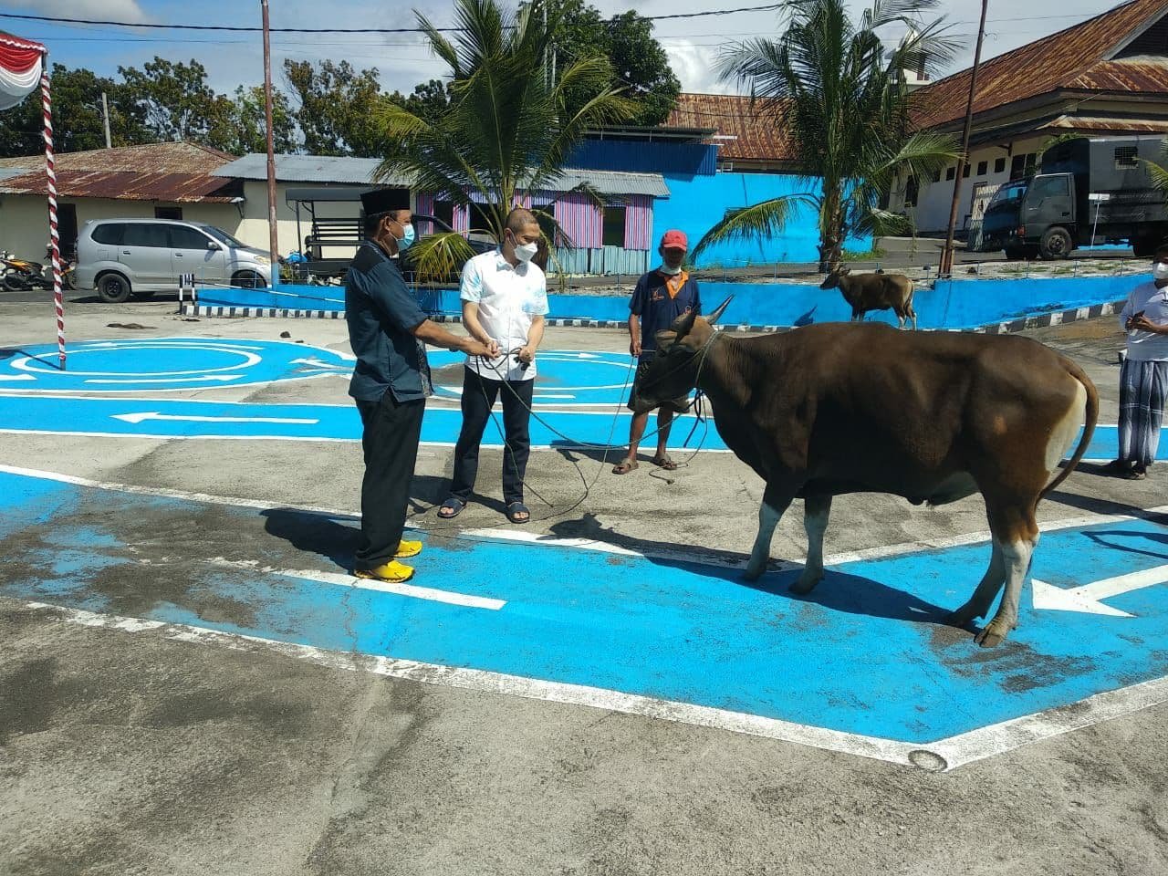 Sebanyak 5 ekor hewan kurban (Sapi) diserahkan Kapolres Bitung AKBP. Indrapramana, H. S.I.K. kepada Ketua panitia pelaksana penyembelihan hewan kurban.
