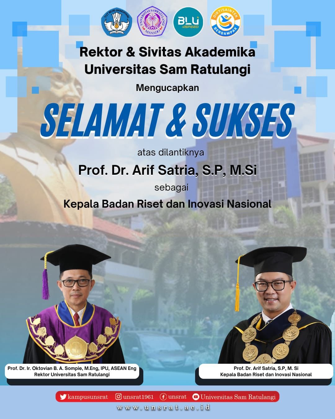 “Sebagai Ketua Himpunan Alumni IPB di Sulawesi Utara, saya mengucapkan selamat atas dilantiknya Prof. Dr. Arif Satria, S.P., M.Si. sebagai Kepala BRIN. Beliau merupakan sosok akademisi visioner yang telah banyak berkontribusi bagi kemajuan riset dan pendidikan di Indonesia,” ujar Prof. Sompie, lulusan program doktor Geotechnical Engineering, Department of Agricultural Engineering, IPB (2010).