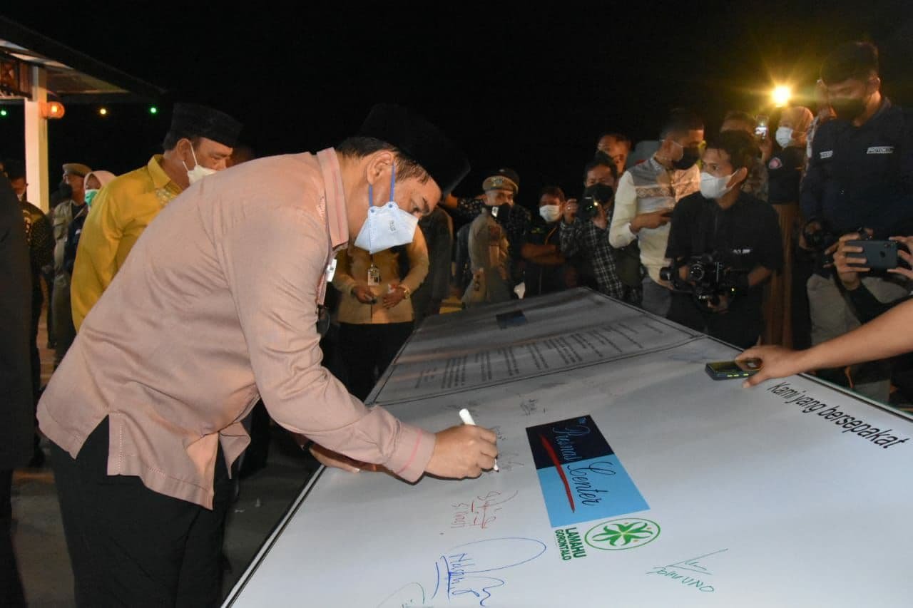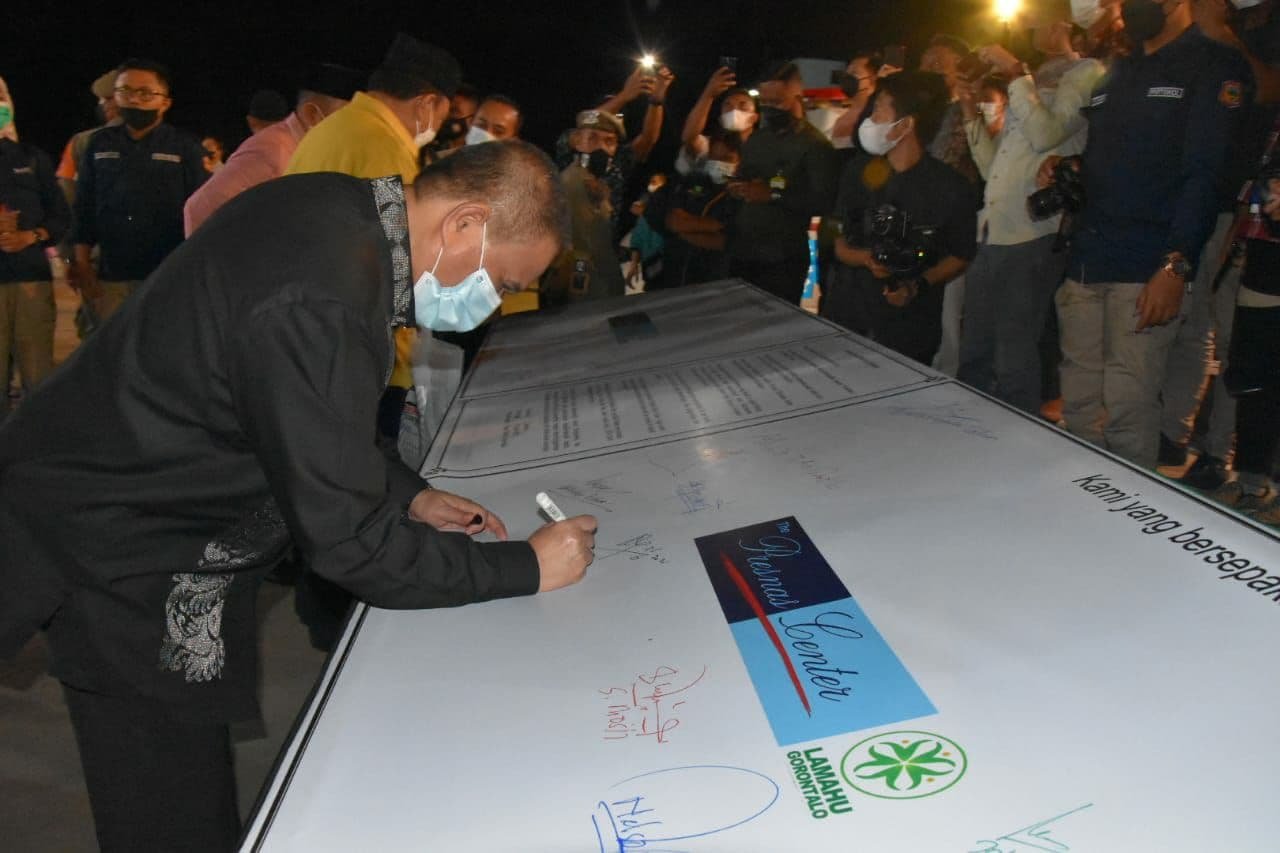 Usai puncak acara Silatnas, para tokoh yang hadir, diantaranya Wakil Ketua MPR-RI, Fdel Muhammad, Anggota DPR-RI Elnino M. Husein Mohi, para Bupati dan Walikota se Gorontalo menandatangani Resolusi Gorontalo Emas 2045 yang terdiri dari 7