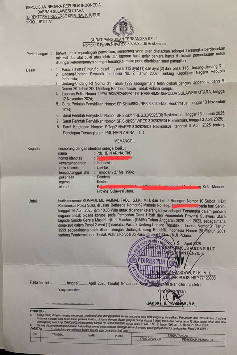 A–TIMES,MANADO– Suratpemanggilan yang mencantumkan nama Ketua Sinode GMIM, Pdt. Dr. Hein Arina, sebagai tersangka dalam kasus dugaan korupsi dana hibah Pemerintah Provinsi Sulawesi Utara, marak beerdar di dunia maya. Dengan kop Kepolisian Daerah Sulawesi Utara itu bernomor: S.Pgl/343/IV/RES.3.3/2025/Dit Reskrimsus, yang ditandatangani oleh Direktur Reserse Kriminal Khusus Polda Sulut, Kombes Pol FX Winardi Prabowo SIK MH, tertanggal 3 April 2024.Dalam surat itu, Hein Arina dijadwalkan menjalani pemeriksaan pada Senin, (14/4/2025). Saat dikonfirmasi Kapolda Sulawesi Utara Irjen Pol Roycke Langie membantah kebenaran informasi tersebut.” Saya rasa Itu hoax,” tegas Kapolda singkat saat dihubungi melalui sambungan telepon, Sabtu (5/4/2025). “Coba tanyakan ke Dirkrimsus,” tambahnya.