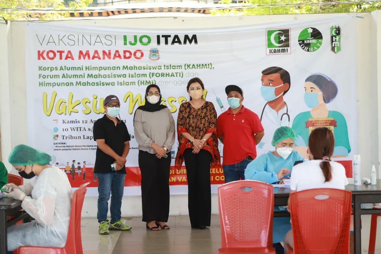 A-TIMES.ID, MANADO — Vaksinasi Ijo Itam yang digelar Korps Alumni Himpunan Mahasiswa Islam (KAHMI), Forum Alumni Himpunan Mahasiswa Islam Wati (Forhati) dan Himpunan Mahasiswa Islam (HMI) di Lapangan Sparta Tikala, Kamis (12/8) kemarin disuport Ketua Tim Penggerak (TP) PKK Kota Manado, Irene Golda Angouw Pinontoan yang bangga karena program pemerintah mendapat dukungan organisasi masyarakat (ormas).