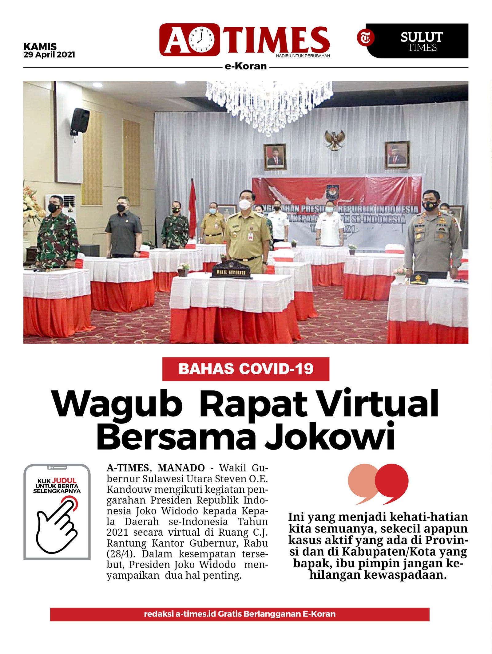 A-TIMES.ID, MANADO – Wakil Gubernur Sulawesi Utara Steven O.E. Kandouw mengikuti kegiatan pengarahan Presiden Republik Indonesia Joko Widodo kepada Kepala Daerah se-Indonesia Tahun 2021 secara virtual di Ruang C.J. Rantung Kantor Gubernur, Rabu (28/4).
