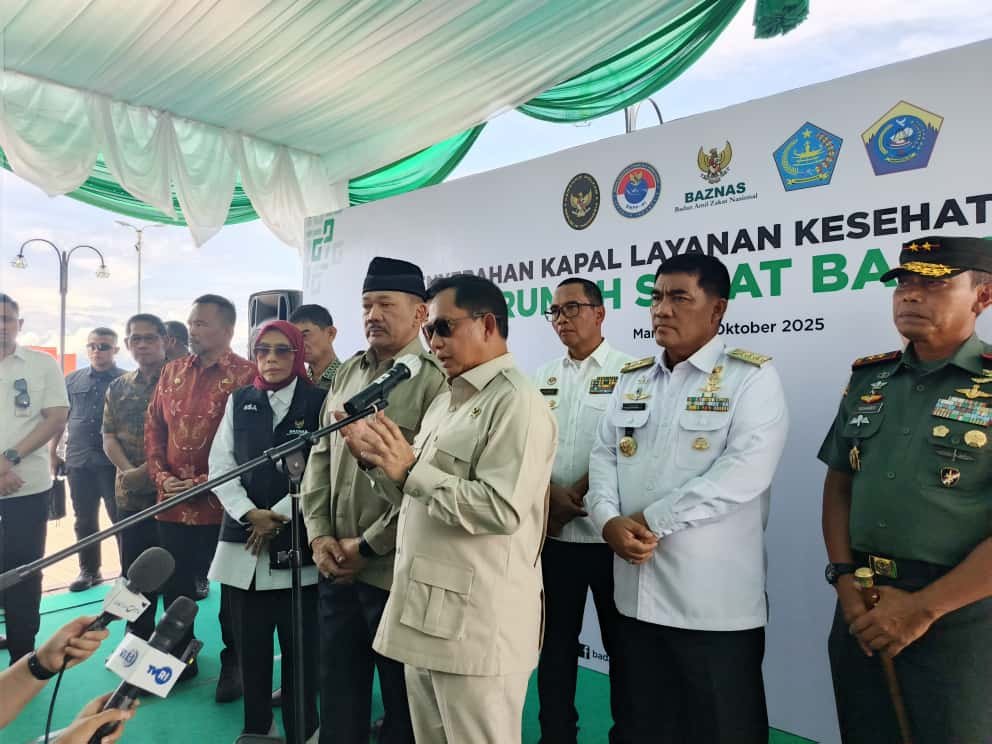 A–TIMES,MANADO-Walikota Bitung Hengky Honandar Kamis,(23/10/2025) menghadiri penyerahan bantuan kapal layanan kesehatan bagi wilayah kepulauan Sangihe dan Talaud dari Baznas RI di kawasan Manado Bay Megamas. Bantuan tersebut diserahkan Mendagri Tito Karnavian kepada gubernur Sulut Yulius Selvanus didampingi jajaran pengurus Baznas RI dan Sulut. Gubernur mengapresiasi bantuan tersebut karena sangat membantu warga diwilayah kepulauan ketiak ada yang sakit untuk langsung ditangani dan dibawa ke fasilitas kesehatan terdekat. Selain Honandar turut hadir Wawali Manado Richard Sualang bersama tokoh agama di Sulut. ” Semoga kedepan Bitung juga bisa mendapatkan bantuan serupa untuk melayani warga Pulau Lembeh,” tambah Honandar ,(*)