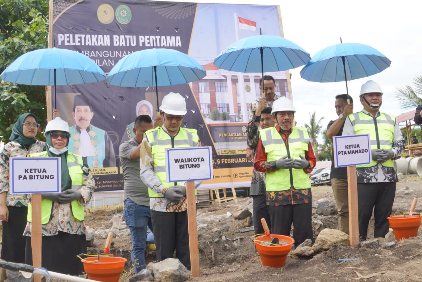 A—TIMES,BITUNG—Pengadilan Agama (PA) Sangat berperan strategis dalam menegakkan hukum dan memberikan keadilan, khususnya dalam perkara keagamaan dan kekeluargaan. Hal ini disampaikan Wali Kota Bitung Hengky Honandar Jumat(6/2/2026) saat hadir pada peletakan batu pertama pembangunan Gedung Pengadilan Agama Kota Bitung du Kelurahan Manembo-Nembo Tengah, Kecamatan Matuari. Ia mengapresiasi Mahkamah Agung RI, Pengadilan Tinggi Agama Manado, dan seluruh pihak yang telah berperan hingga proyek ini dapat direalisasikan.” Ini juga sejalan dengan visi ” Harmonisasi Menuju Bitung Maju” pungkasnya. Ia berharap gedung tersebut nantinya bukan hanya simbol penegakan hukum tetapi juga menjadi ruang yang mencerminkan keadilan,keterbukaan dan Harmonisasi. Hadir dan melakukan peletakan batu pertama Ketua Pengadilan Tinggi Agama Manado bersama Walikota dan Wakil Walikota Bitung Randito Maringka disaksikan Forkopimda, tokoh agama, jajaran Pengadilan Agama Bitung, Kementerian Agama, dan lainnya Ketua Pengadilan Agama Bitung, Harisan Upuolat, S.H.I., M.H., menyampaikan terima kasih kepada Ketua Pengadilan Tinggi Agama Manado serta Pemerintah Kota Bitung atas dukungan dan kehadiran dalam kegiatan tersebut.” Pembangunan  gedung Pengadilan Agama Kota Bitung diharapkan dapat meningkatkan kualitas pelayanan hukum yang representatif, nyaman, dan berwibawa bagi masyarakat pencari keadilan,” jelas Harisan.(*)