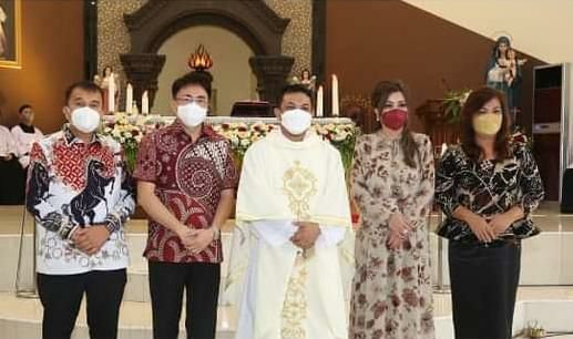 A-TIMES, MANADO – Perayaan Natal kedua di tahun 2021 di Kota Manado berjalan aman dan damai. Walikota, Andrei Angouw bersama istri tercinta, Irene Golda Angouw Pinontoan, Minggu (26/12) kemarin menghadiri Perayaan Ekaristi Keluarga Kudus dan dirangkaikan dengan Safari Natal Pemerintah Kota Manado di Gereja Katolik Bunda Hati Kudus Kairagi, dipimpin Pastor Paroki RD Troyani Kalengkongan.