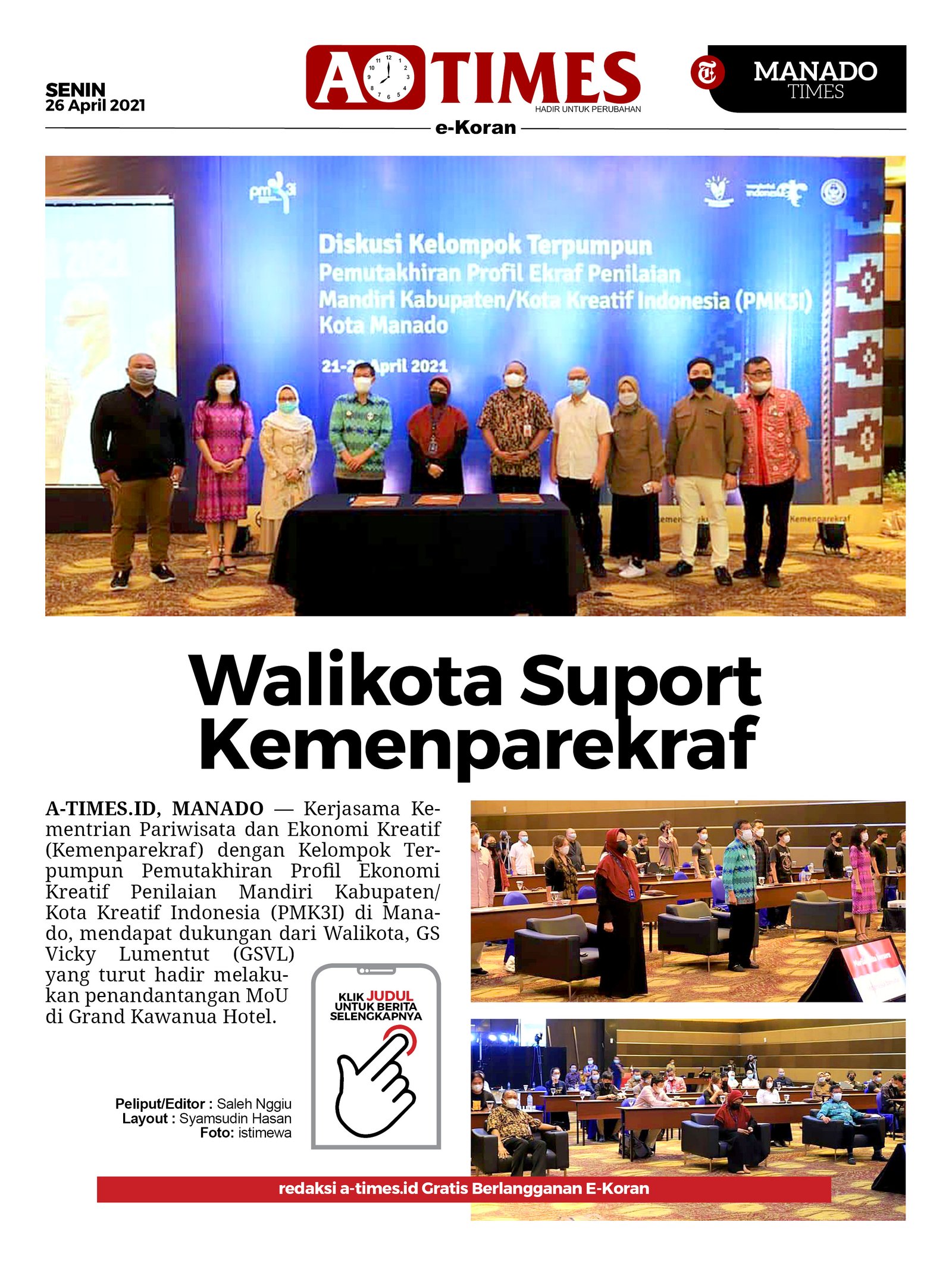 A-TIMES.ID, MANADO — Kerjasama Kementrian Pariwisata dan Ekonomi Kreatif (Kemenparekraf) dengan Kelompok Terpumpun Pemutakhiran Profil Ekonomi Kreatif Penilaian Mandiri Kabupaten/ Kota Kreatif Indonesia (PMK3I) di Manado, mendapat dukungan dari Walikota, GS Vicky Lumentut (GSVL) yang turut hadir melakukan penandantangan MoU di Grand Kawanua Hotel.