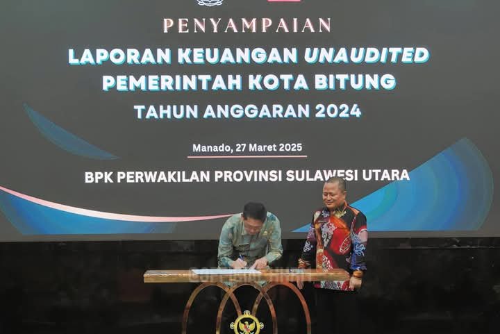 A-TIMES, MANADO–Walikota Bitung, Hengky Honandar, Kamis(27/3/2015) menyampaikan Laporan Keuangan Unaudited Pemerimtah kota Bitung tahun 2024 dikantor BPK RI Perwakklan Sulut di Manado. Honandar hadir bersama Gubernur Yulius Selvanus, Wagub Victor Mailangkay, Sekprov Steve Kepel dan bupati, walikota se-Sulut.