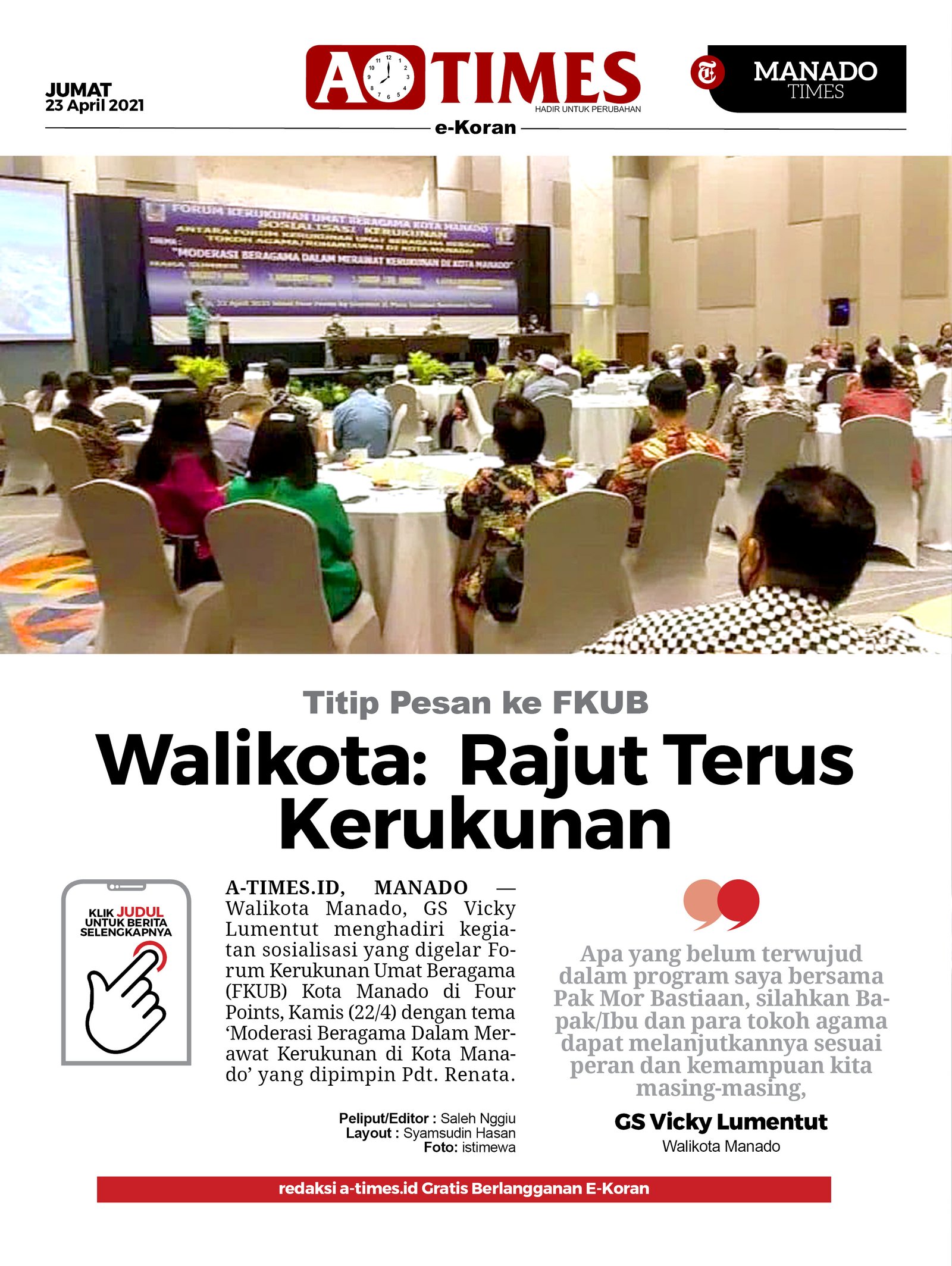 A-TIMES.ID, MANADO — Walikota Manado, GS Vicky Lumentut menghadiri kegiatan sosialisasi yang digelar Forum Kerukunan Umat Beragama (FKUB) Kota Manado di Four Points, Kamis (22/4) dengan tema ‘Moderasi Beragama Dalam Merawat Kerukunan di Kota Manado’ yang dipimpin Pdt. Renata.