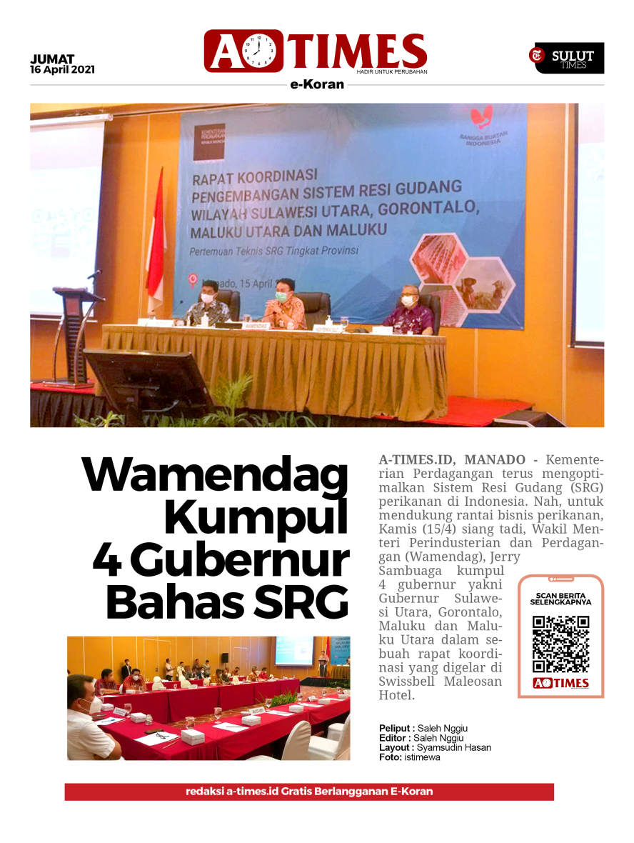 A-TIMES.ID, MANADO — Kementerian Perdagangan terus mengoptimalkan Sistem Resi Gudang (SRG) perikanan di Indonesia. Nah, untuk mendukung rantai bisnis perikanan, Kamis (15/4) siang tadi, Wakil Menteri Perindusterian dan Perdagangan (Wamendag), Jerry Sambuaga kumpul 4 gubernur yakni Gubernur Sulawesi Utara, Gorontalo, Maluku dan Maluku Utara dalam sebuah rapat koordinasi yang digelar di Swissbell Maleosan Hotel.